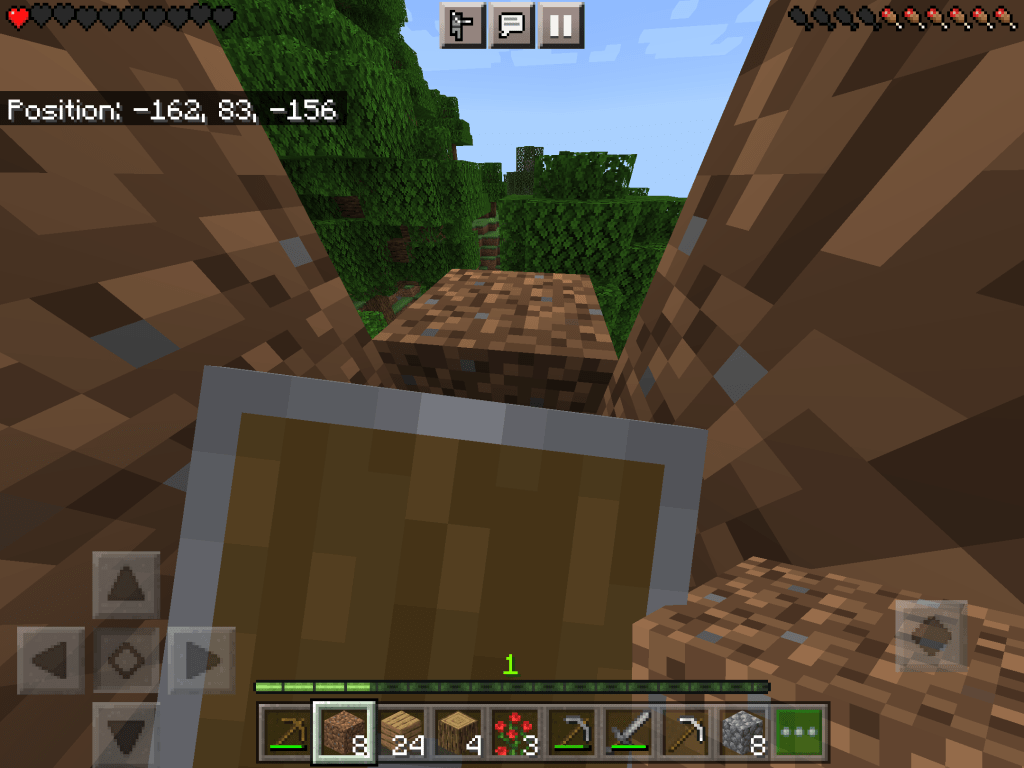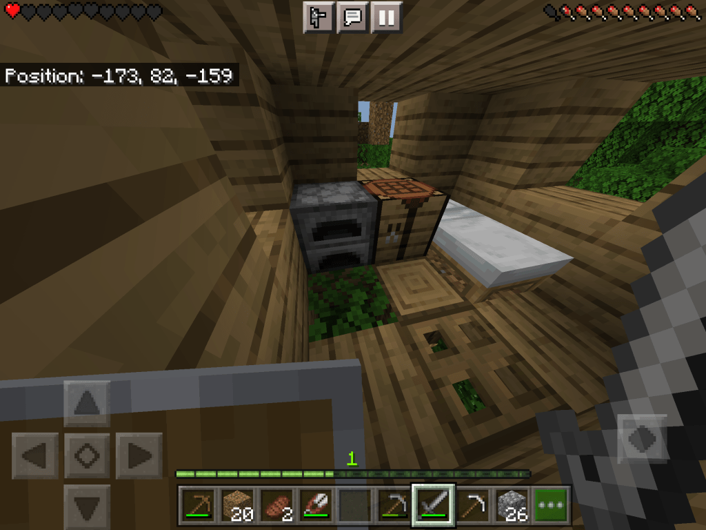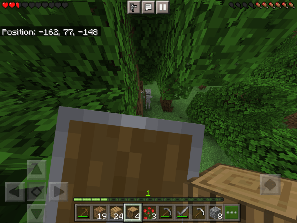 I got a bed with shears and some sheep. I nearly died from a skeleton attack (image below)The skeleton (I had to screenshot with the shield so I didn’t die) You can see how bad they are at accuracy – it has shot the tree beside it.I built some protection to protect myself on a tree.